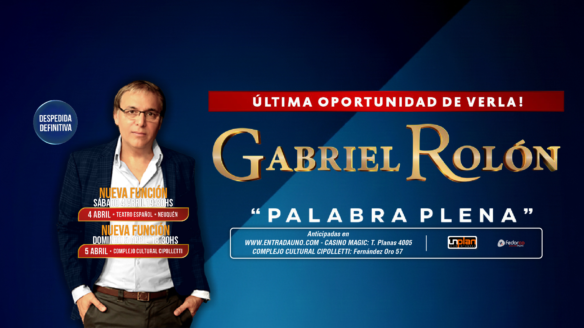 Más información »“El Lic. Gabriel Rolón” Presenta: “Palabra Plena” –DESPEDIDA DEFINITIVA!! Más de 400.000 espectadores ya la vieron!! PALABRA PLENA Somos humanos en tanto habitamos un mundo de palabras. Un mundo lleno de imágenes y personas que no veremos jamás, y sin embargo nos recorren. Dar la palabra es darse uno mismo, siempre y cuando no…