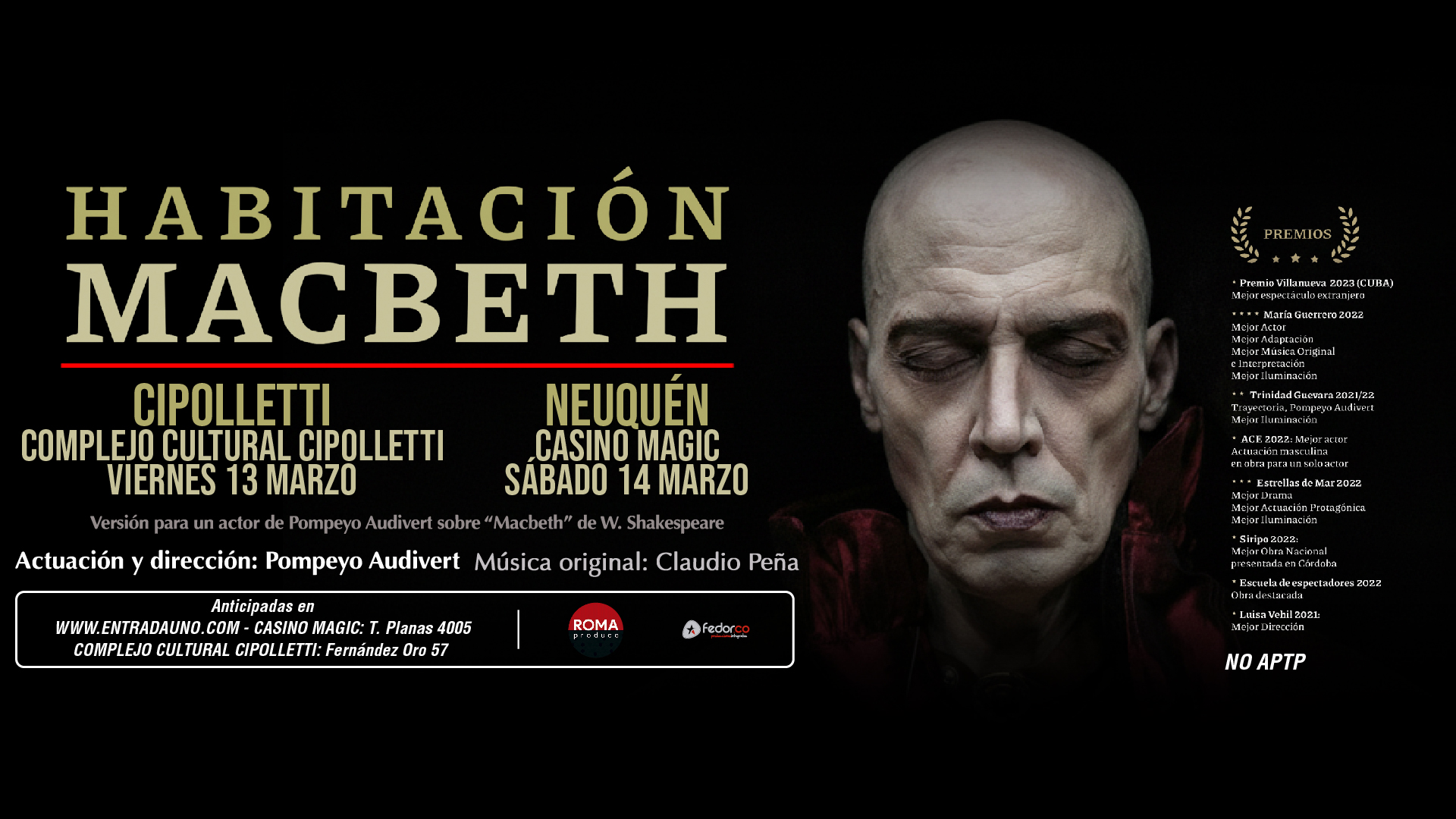 Más información »Habitación Macbeth (Versión para un actor) de Pompeyo Audivert sobre Macbeth de W. Shakespeare Actuación y dirección Pompeyo Audivert // Música original de Claudio Peña “Habitación Macbeth”, la obra de teatro argentino más premiada, comenzando este año su 6ta. temporada consecutiva, desde su estreno en marzo de 2021, lleva más de 400 funciones realizadas…