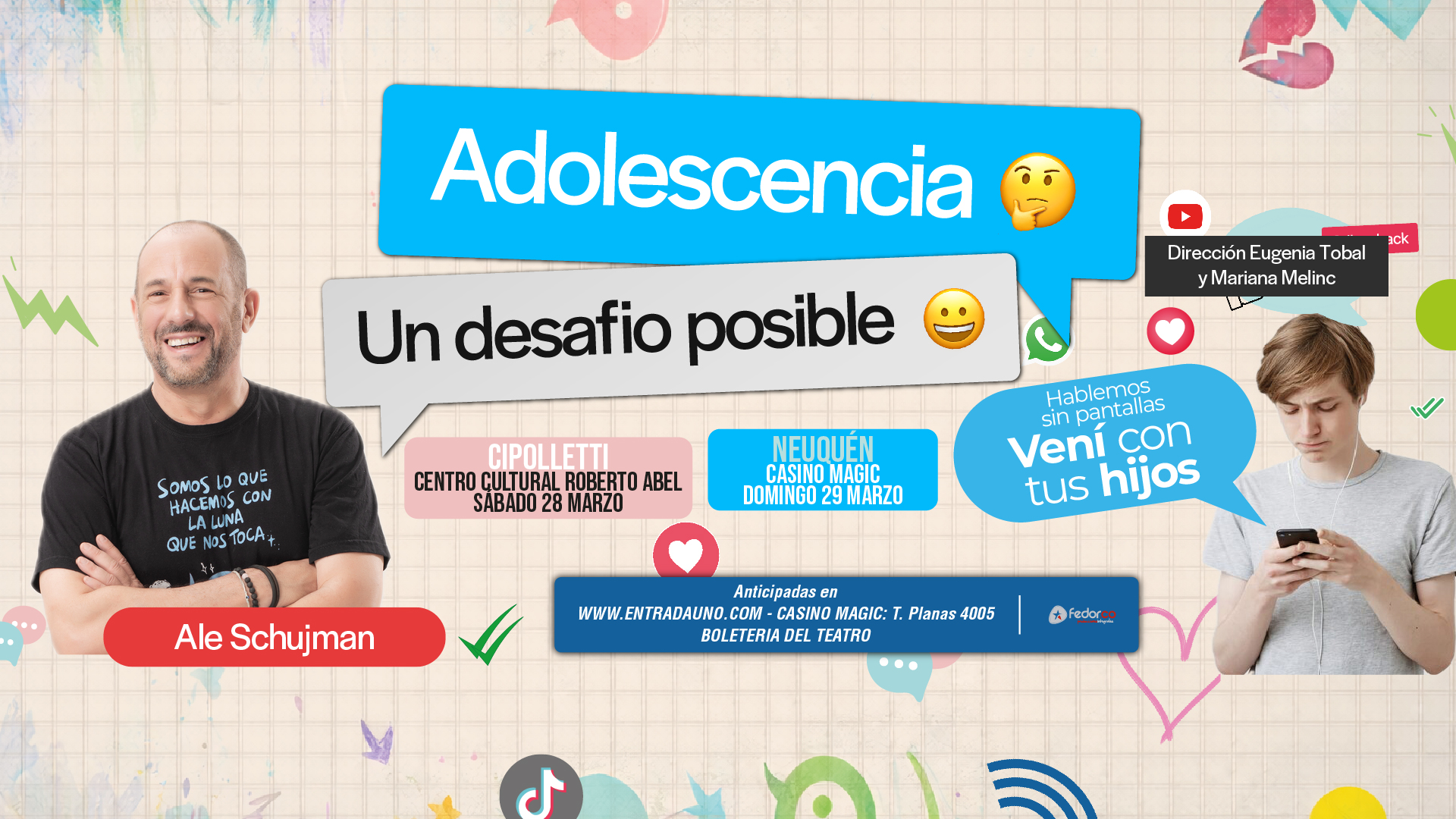 Más información »Adolescencia un desafío posible, es una invitación a un encuentro en familia. El unipersonal del psicólogo Ale Schujman, con dirección de Eugenia Tobal, es una propuesta que invita a valorar el amor propio: como el factor de protección más valioso para nuestros hijos. La comunicación a través de monitores apagados, miradas encendidas, y el…
